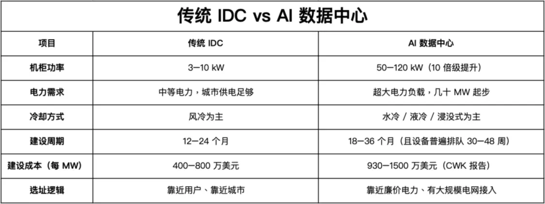 而AI數(shù)據(jù)中心最大痛點(diǎn)是電力指標(biāo)、電網(wǎng)接入和冷卻系統(tǒng)的極限性能。完全不是一個(gè)物種,IDC機(jī)房基本被歸到輕工業(yè)、IT服務(wù),到了AI數(shù)據(jù)重心屬于妥妥的重工業(yè)。