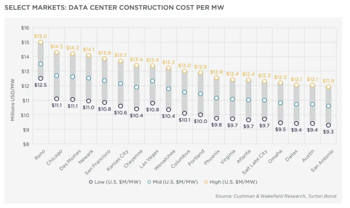 平均每MW的建設(shè)成本漲到930–1500萬(wàn)美元,開(kāi)發(fā)商被迫向二三線地區(qū)遷移。現(xiàn)在玩的是誰(shuí)能拿到電,誰(shuí)才能談算力,誰(shuí)能把場(chǎng)站交付出來(lái),誰(shuí)才能談AI。