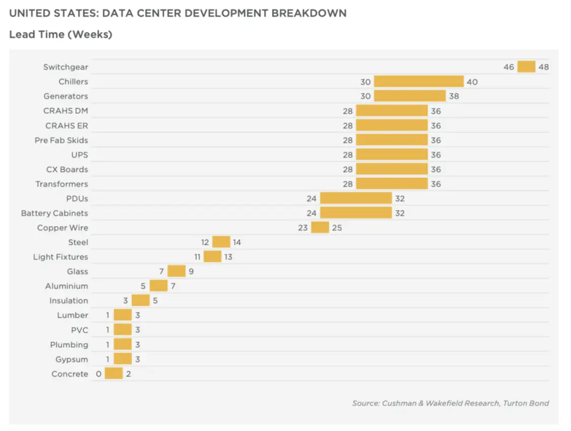 所以行業(yè)現(xiàn)在普遍共識(shí)不是缺GPU,而是缺能讓GPU通電的地方。Cushman & Wakefield的2025報(bào)告提到,北美成熟市場(chǎng)已經(jīng)全面進(jìn)入電力短缺,變壓器、UPS、switchgear的交付周期普遍拉到30–48周。