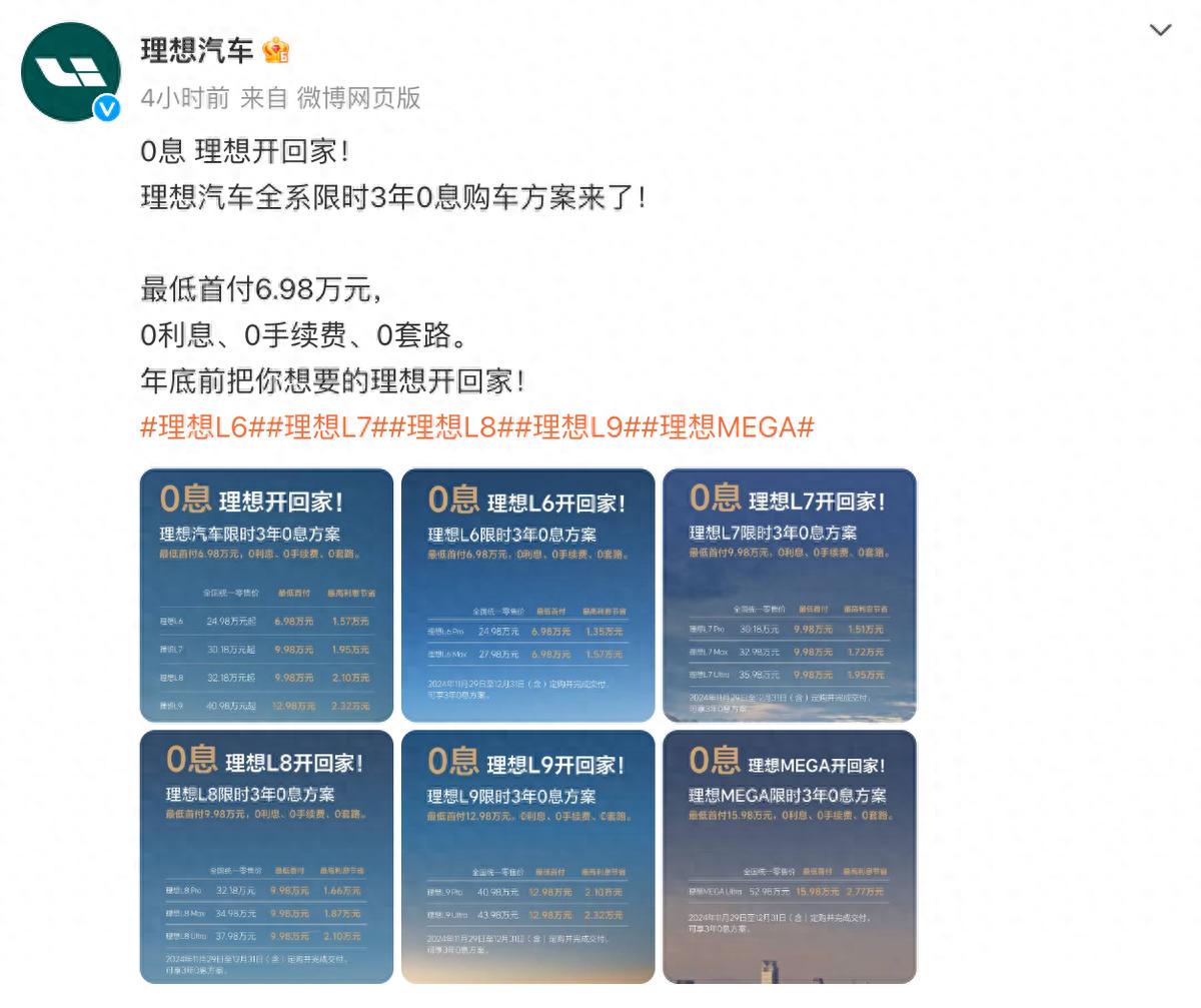理想汽車在11月29日宣布,從即日起至12月31日(含),消費者定購并完成交付的全系車型均可享受限時3年0息的金融購車政策。這一政策覆蓋了理想L6、L7、L8、L9以及最新發布的MEGA五款車型,每款車型都給出了具體的首付金額和最高利息節省額度。