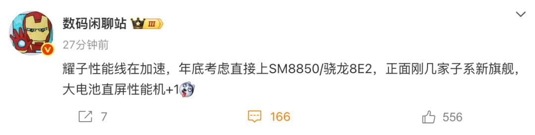 而近期的時候有爆料稱,榮耀這邊性能線的機型在加速,準備在年底的時候推出搭載驍龍8 Elite2機型的新機,和友商的高性能機型正面硬剛!且經過榮耀GT的教訓后,這次榮耀不含糊的直接用上了大電池。
