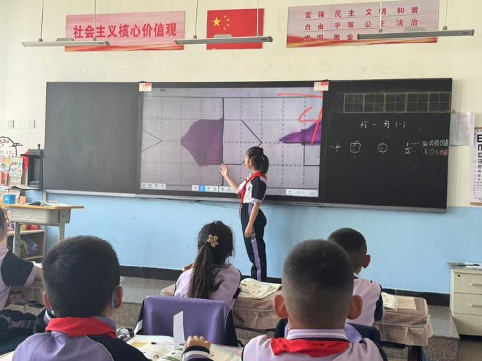 聶維維老師執教北師大版三年級數學《分一分(一)》,以 “淘氣笑笑分蘋果” 生活情境導入,通過 “實物分一分 — 圖形折一折 — 符號表示二分之一” 漸進式教學,將抽象分數概念具象化。小組合作環節中,學生利用圓形紙片、方格紙等學具創造分數,在互助中突破 “分數意義” 理解難點。教研員陳志芳點評:“建議增加超市價格標簽、建筑圖紙比例等生活案例,強化分數知識的實踐遷移。”