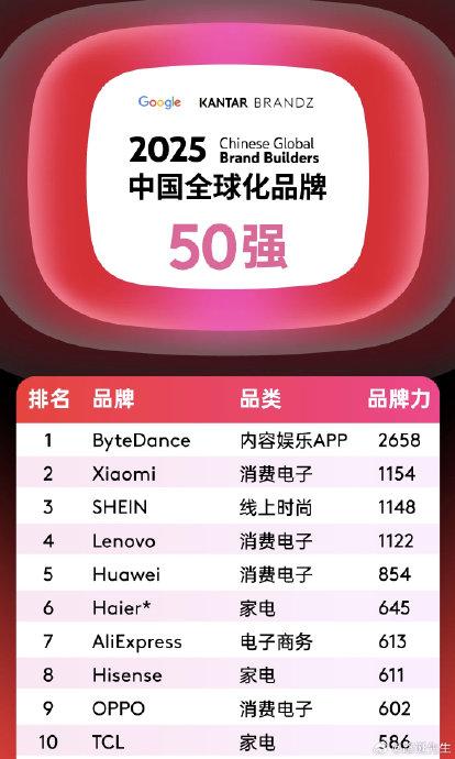 凱度攜手Google正式發布《2025凱度BrandZ中國全球化品牌》50強榜單。