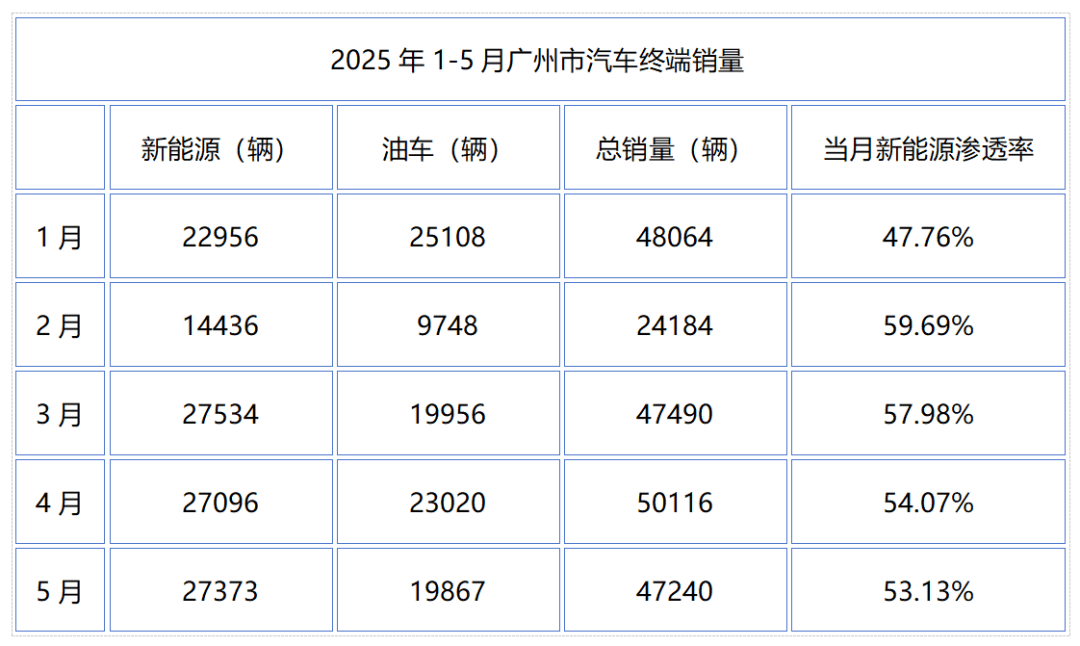 據統計,今年前5個月,廣州市累計銷售新車21.84萬輛,同比增長7.61%,居于全國前列。除了1月份,每月的新能源滲透率都在一半以上,但油車的占比卻很穩定,并沒有下滑太快;廣州的新能源滲透率,一直高于全國平均水平。