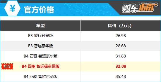 在全系車型中,我們特別推薦的是指導(dǎo)價(jià)為32.08萬元的B4 四驅(qū) 智遠(yuǎn)極夜黑版。通過配置對(duì)比可以看出,推薦車型相比較低一級(jí)車型,更換為尺寸更大的20英寸輪轂,并加入了運(yùn)動(dòng)外觀套件,視覺上更為個(gè)性時(shí)尚。同時(shí)座椅材質(zhì)也從仿皮升級(jí)為皮/翻毛材質(zhì)混搭,價(jià)格僅比較低一級(jí)車型多了0.2萬元,可謂物超所值。