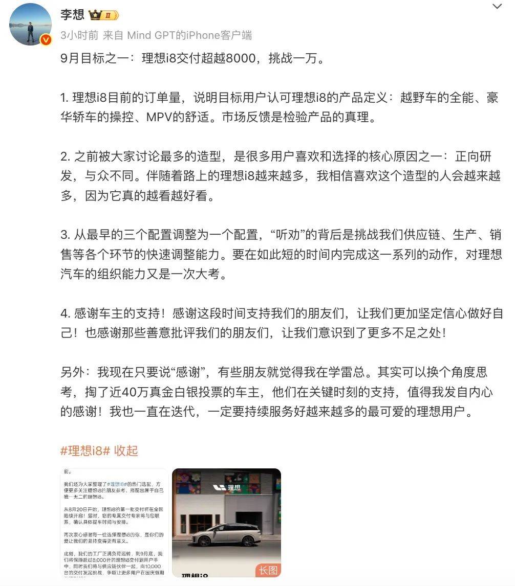 在此前的7月29日,理想全新純電SUV i8上市,共推出3個(gè)配置,定價(jià)32.18萬-36.98萬元。面對市場反饋,在i8上市一周后,理想緊急調(diào)整價(jià)格和配置,將最早的三個(gè)配置調(diào)整為一個(gè)配置,還在降價(jià)1萬元的同時(shí)新增了價(jià)值1萬元的鉑金音響。在當(dāng)時(shí),李想發(fā)文承認(rèn)失誤,稱對i8的配置和定價(jià)上陷入了L8的慣性思維。此次理想積極地調(diào)整,對i8的訂單增長起到一定刺激作用。另外,理想i8與乘龍卡車的碰撞測試引發(fā)的負(fù)面輿論,也給i8產(chǎn)生一定負(fù)面影響。