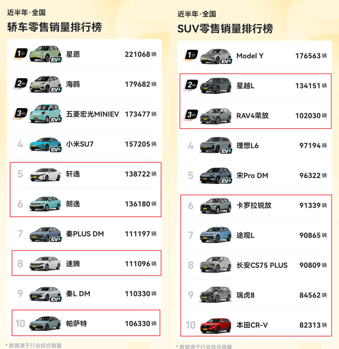 SUV市場亦是如此,近半年來SUV三強僅有特斯拉ModelY拿下第一,亞季軍分別是吉利星越L和豐田榮放,十強中除了這兩款車,SUV十強中海油豐田銳放、大眾途觀L、CS75、瑞虎8和本田CR-V,再往后則是大眾探岳,吉利博越L、豐田鋒蘭達,油車依舊占據了重要地位,去滿足消費者對出行的需求。