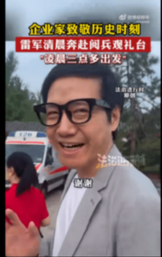 雷軍凌晨三點多出發觀看閱兵,佩戴小米AI眼鏡